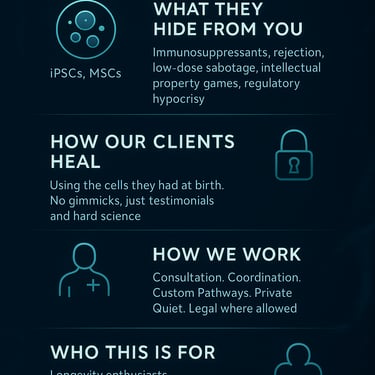 私たちは、制度の外で活動するエリート科学者たちと直接連携し、自己由来幹細胞(オートローガス)、エクソソーム、そして胚性プログラミング技術を活用し、従来治療不可能とされた疾患を静かに癒やしてきました。