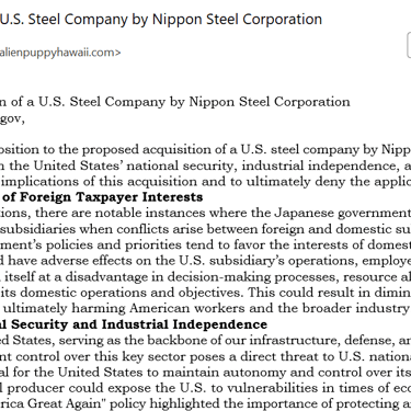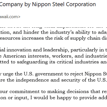 In light of the concerns outlined above, I strongly urge the U.S. government to reject Nippon Steel’s acquisition of the U.S. steel company. This decision would protect American workers, ensure the independence and security of the U.S. steel industry, and align with the principles of economic and industrial resilience.